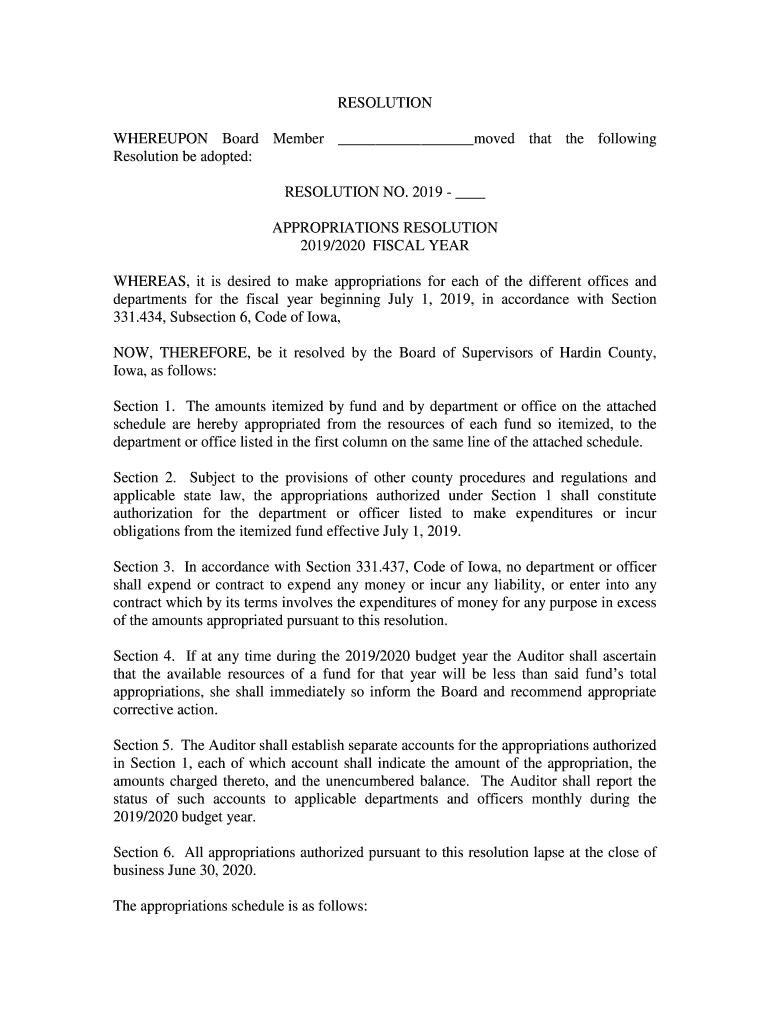 RESOLUTION WHEREUPON Board Member moved that the following Resolution be adopted: RESOLUTION NO. 2019 APPROPRIATIONS RESOLUTION 2019/2020 FISCAL YEAR WHEREAS, it is desired to make appropriations