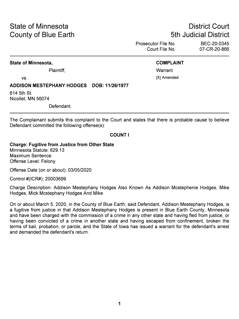 StateofMinnesota CountyofBlueEarthDistrictCourt 5thJudicialDistrict ProsecutorFileNo. CourtFileNo. StateofMinnesota,BEC200345 07CR20866COMPLAINTPlaintiff,Warrant X Amended vs. ADDISONMESTEPHANYHODGESDOB:11/26/1977