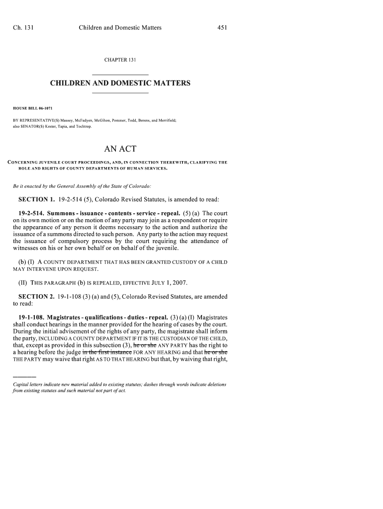 Ch. 131Children and Domestic Matters451CHAPTER 131 CHILDREN AND DOMESTIC MATTERS HOUSE BILL 061071 BY REPRESENTATIVE(S) Massey, McFadden, McMahon, Pommel, Todd, Barns, and Terrified; also SENATOR(S)
