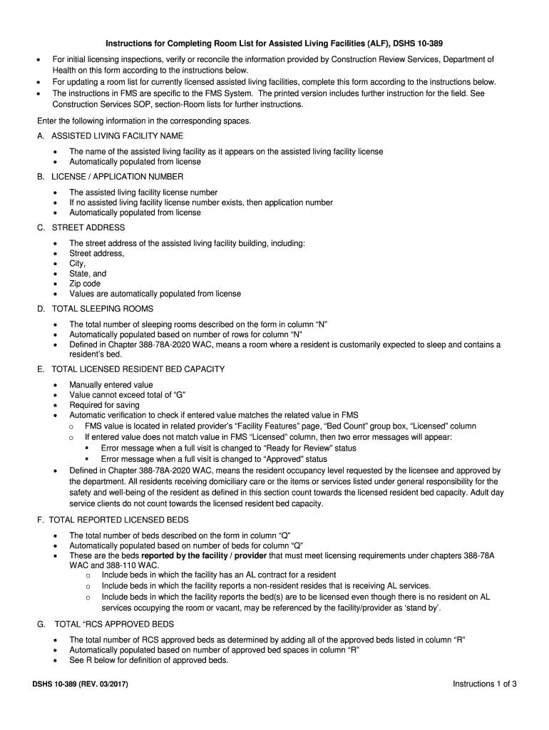 Instructions for Completing Room List for Assisted Living Facilities (ALF), DSS 10389 For initial licensing inspections, verify or reconcile the information provided by Construction Review Services,
