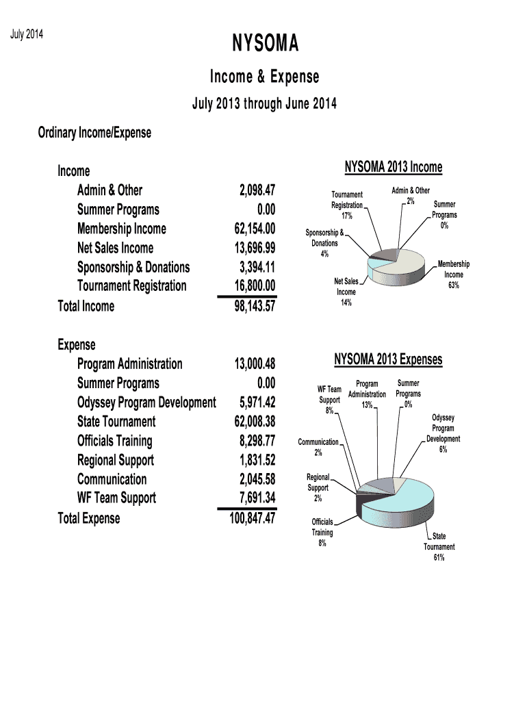 NYSOMAJuly 2014Income & Expense July 2013 through June 2014 Ordinary Income/Expense Income Admin & Other Summer Programs Membership Income Net Sales Income Sponsorship & Donations Tournament Registration