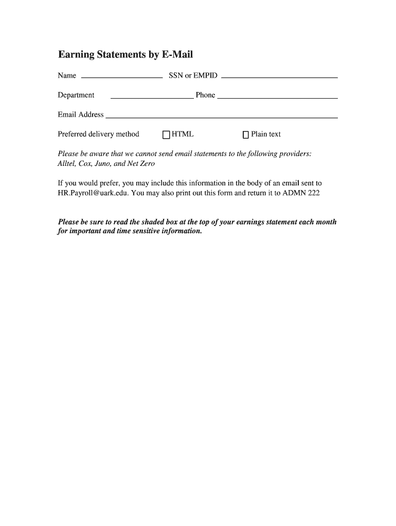Key fields included in the form are the employee's name, SSN or EMPID, department, phone number, email, and preferred delivery format (either HTML or plain text). Using the Employee Earnings Statement Delivery Form effectively can streamline communication between employees and payroll departments.