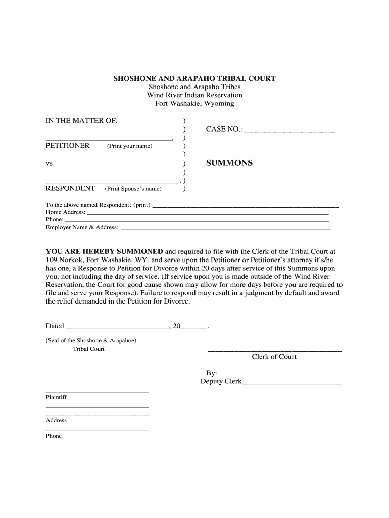 SHOSHONE AND ARAPAHO TRIBAL COURT Shoshone and Arapaho Tribes Wind River Indian Reservation Fort Washable, Wyoming IN THE MATTER OF:)), ) PETITIONER (Print your name))) vs.) ),) RESPONDENT (Print