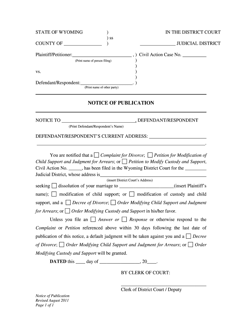 STATE OF WYOMING COUNTY OF)) SS) IN THE DISTRICT COURT JUDICIAL DISTRICT Plaintiff/Petitioner:,) Civil Action Case No. )) vs.) ) Defendant/Respondent:. ) (Print name of person filing) (Print name