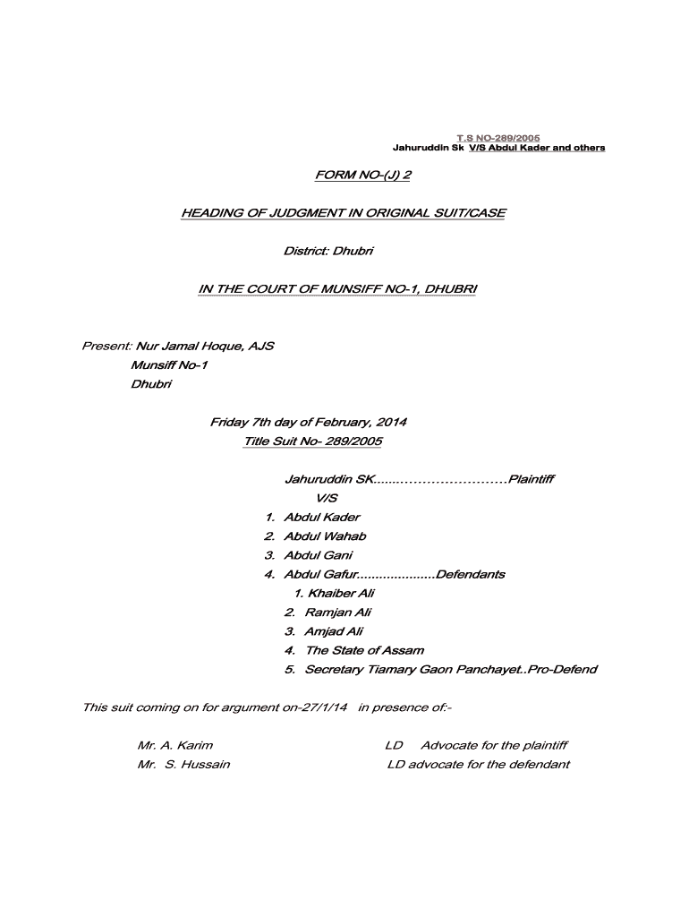 Get the free FORM NO-(J) 2 HE DING OF JUDGMENT IN ORIGIN L SUIT/C ... - dhubrijudiciary gov