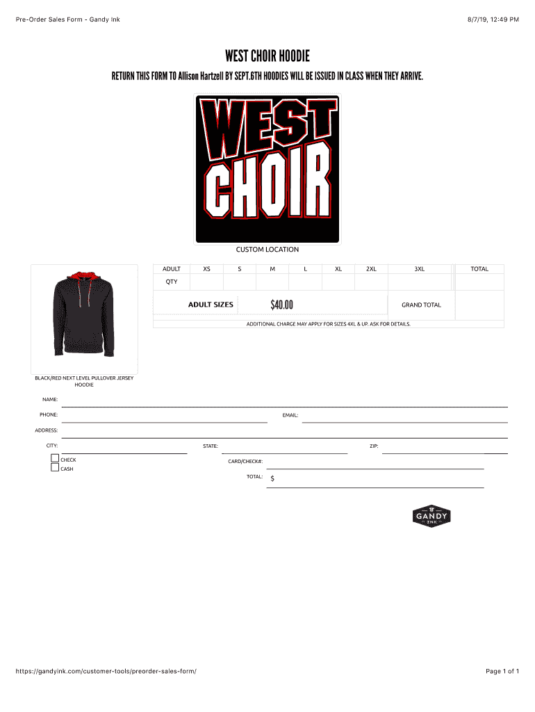 PreOrder Sales Form Andy Ink8/7/19, 12)49 WEST CHOIR HOODIE RETURN THIS FORM TO Allison Hartnell BY SEPT.6TH HOODIES WILL BE ISSUED IN CLASS WHEN THEY ARRIVE.CUSTOM LOCATION ADULTXSSMLXL2XL3XLTOTALQTY$40.00ADULT