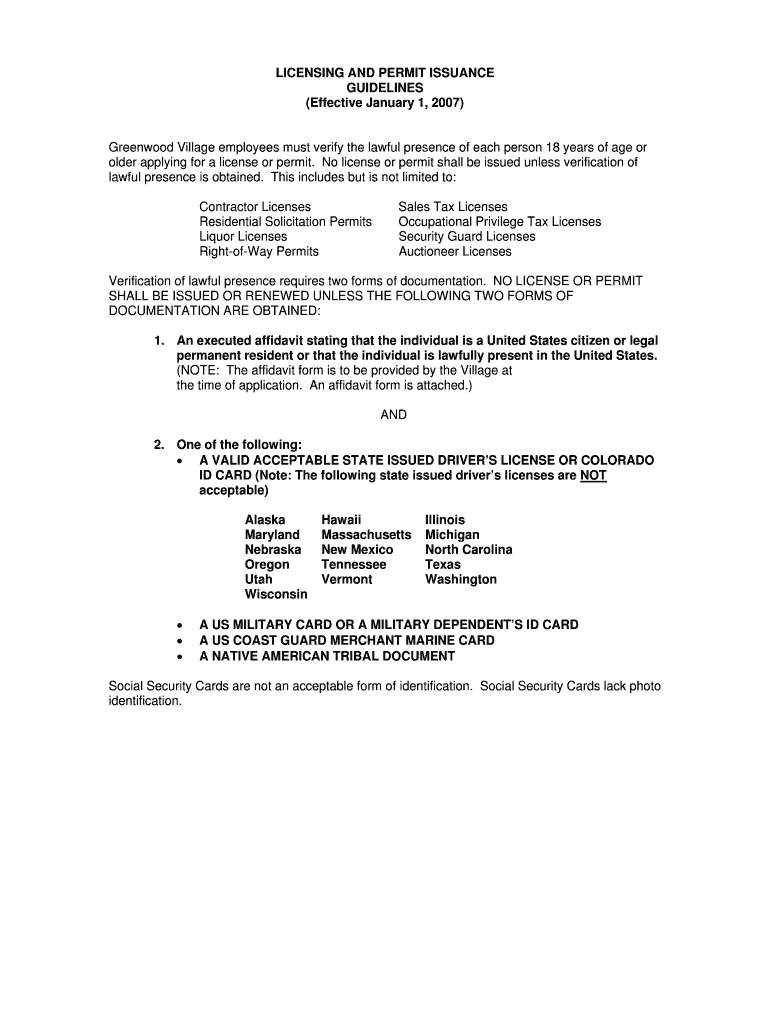 (Effective January 1, 2007)Greenwood Village employees must verify the lawful presence of each person 18 years of age or
