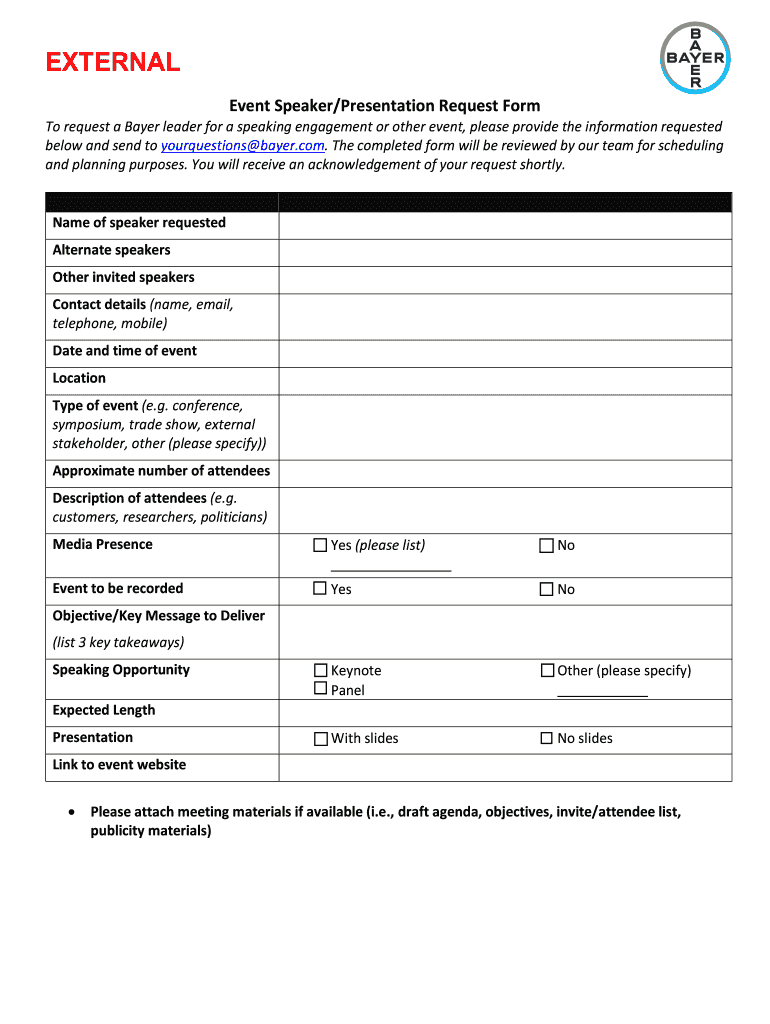 To request a Bayer leader for a speaking engagement or other event, please provide the information requested