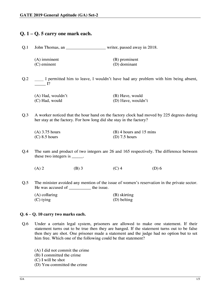 GATE 2019 General Aptitude (GA) Set2Q. 1 Q. 5 carry one mark each. Q.1John Thomas, a writer, passed away in 2018. (A) imminent (C) eminent.2(B) prominent (D) dominant I permitted him to leave, I wouldn't