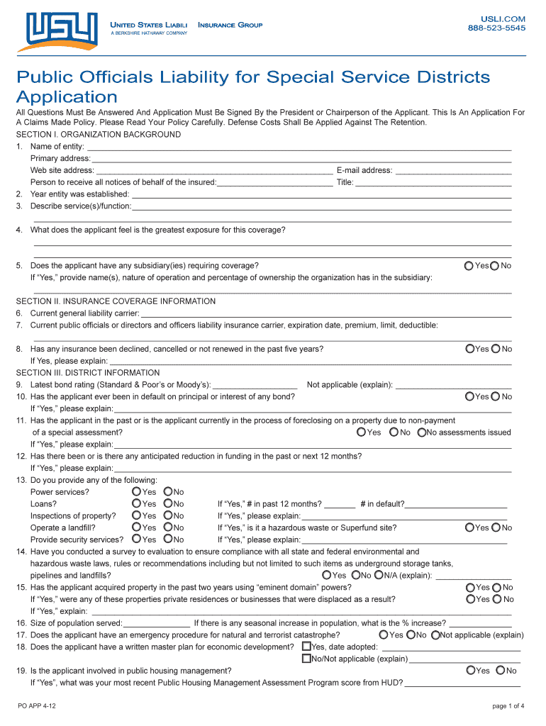 The Public Officials Liability Application is a service agreement used by special service districts to apply for a claims-made insurance policy.