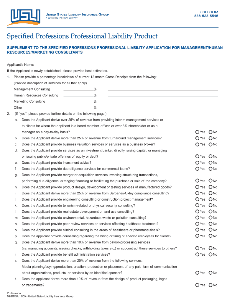 This form is designed for management, human resources, and marketing consultants in the US who are applying for professional liability insurance.