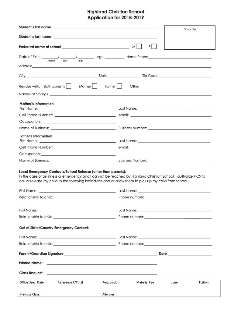Highland Christian School Application for 20182019 Students first nameOffice Students last name Preferred name at schoolmate of Birth / / Age Home Phone MonthDayYearAddress City State Zip Code Resides