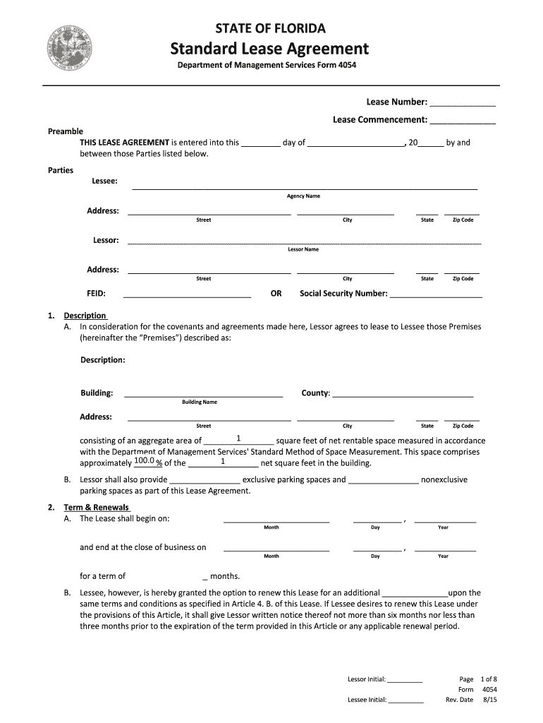 STATE OF FLORIDAStandard Lease Agreement Department of Management Services Form 4054Lease Number: Lease Commencement: Preamble THIS LEASE AGREEMENT is entered into this day of, 20 by and between those
