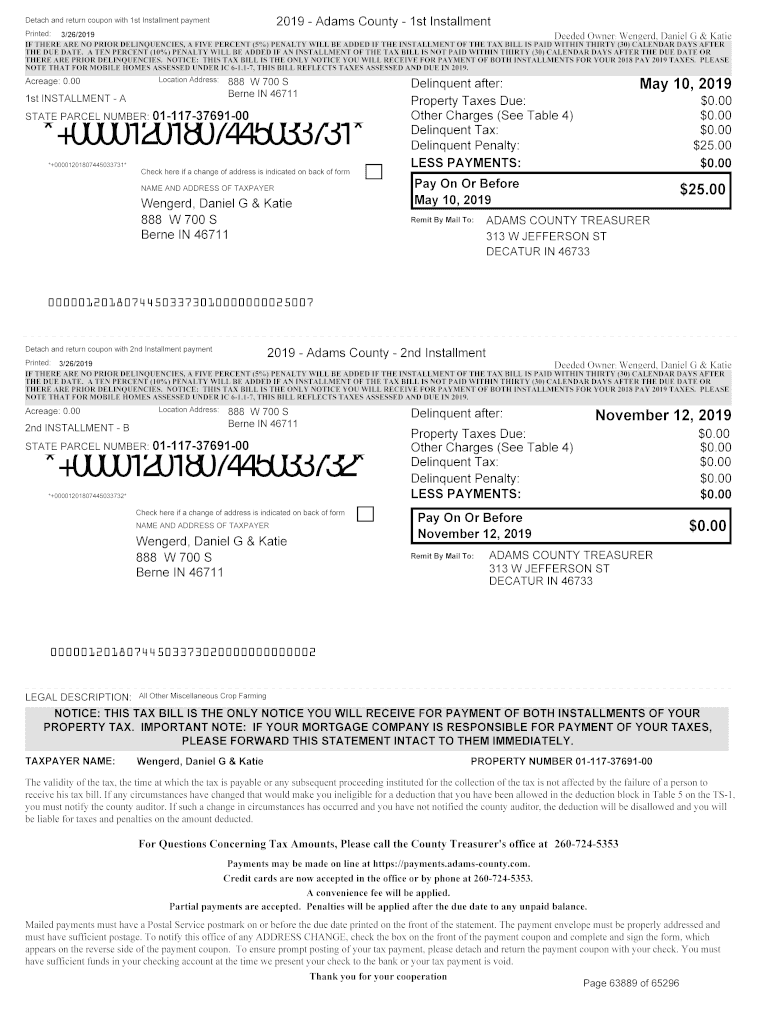 2019 Adams County 1st InstallmentDetach and return coupon with 1st Installment paymentPrinted: 3/26/2019 Deeded Owner: Winged, Daniel G & Katie IF THERE ARE NO PRIOR DELINQUENCIES, A FIVE PERCENT