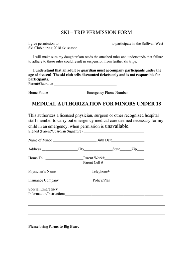 SKI TRIP PERMISSION FORM I give permission to participate in the Sullivan West Ski Club during 2018 ski season. I will make sure my daughter/son reads the attached rules and understands that failure