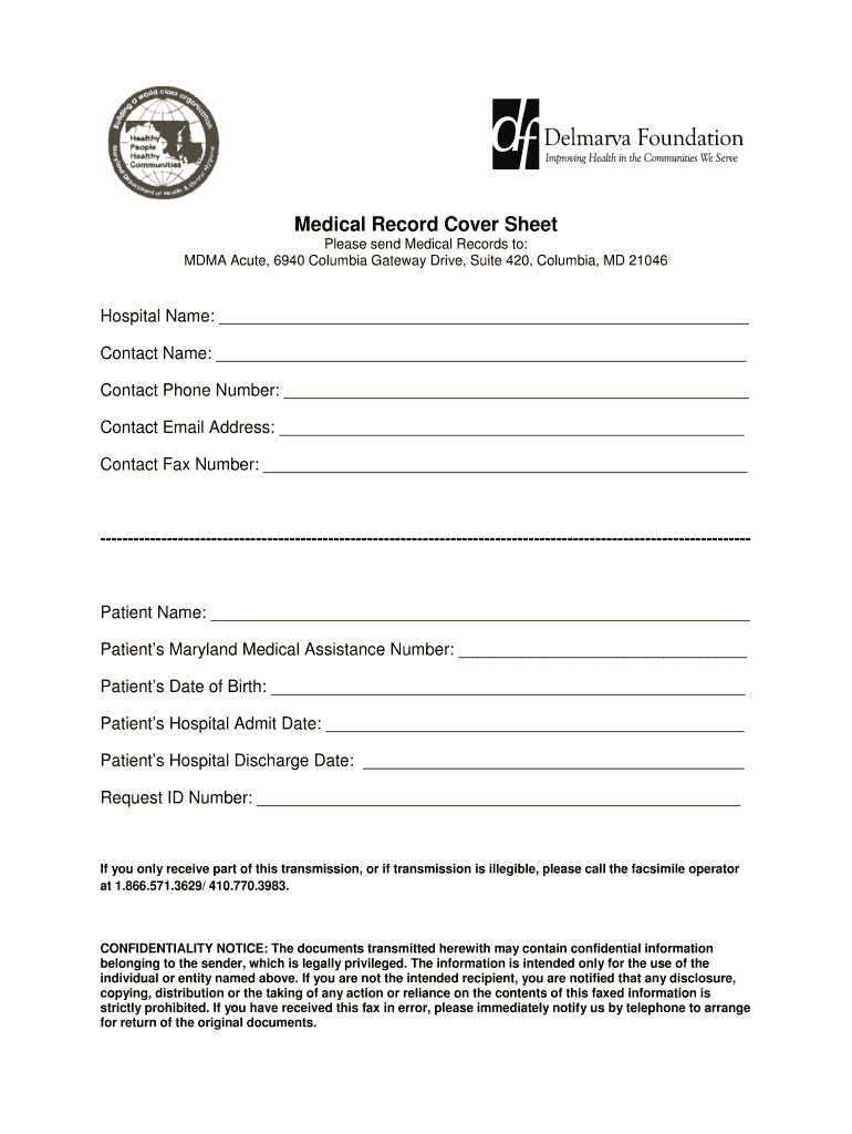 The Medical Record Cover Sheet is a healthcare form used by patients to request and send medical records to MDMA Acute in Maryland.