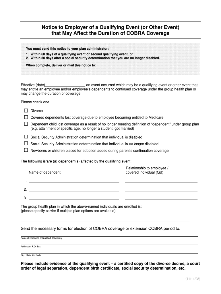 Notice to Employer of a Qualifying Event (or Other Event) that May Affect the Duration of COBRA Coverage You must send this notice to your plan administrator: 1. Within 60 days of a qualifying event
