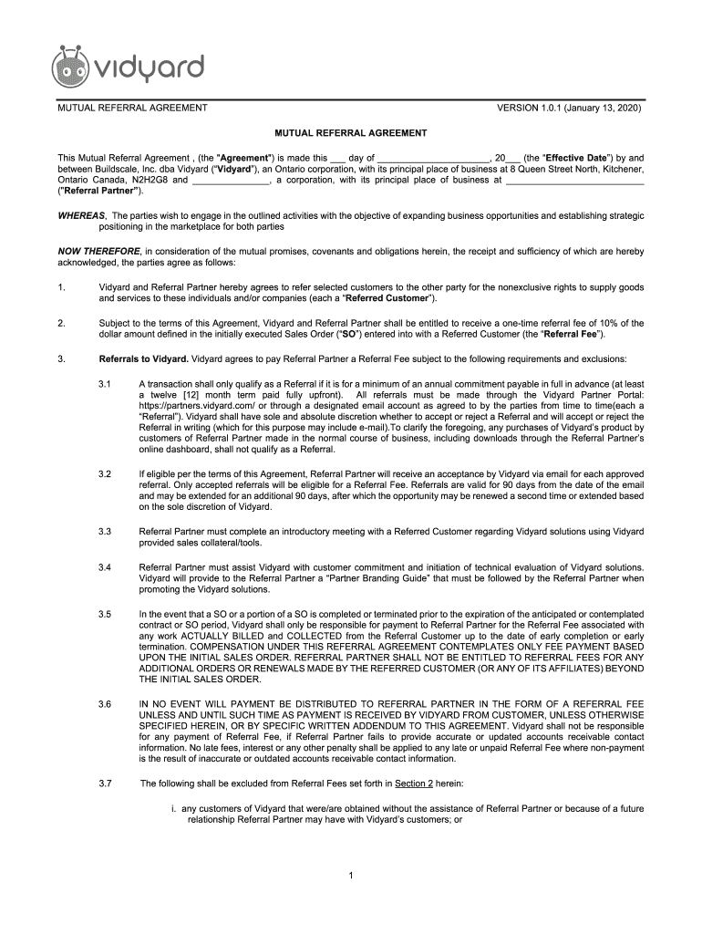 MUTUAL REFERRAL AGREEMENTVERSION 1.0.1 (January 13, 2020) MUTUAL REFERRAL Agreements Mutual Referral Agreement, (the “Agreement “) is made this day of, 20 (the Effective Date) by and between Build
