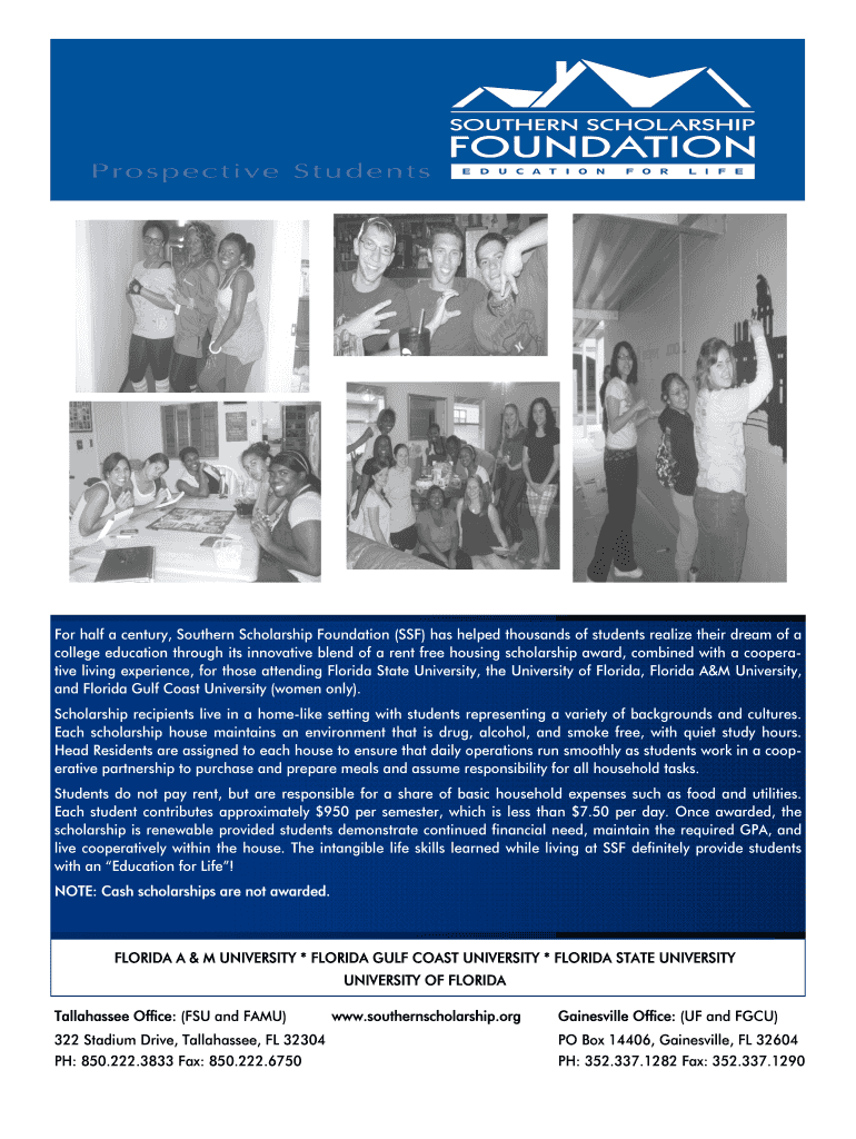 The Southern Scholarship Foundation Application is a scholarship application form used by students to apply for rent-free housing scholarships at selected Florida universities.