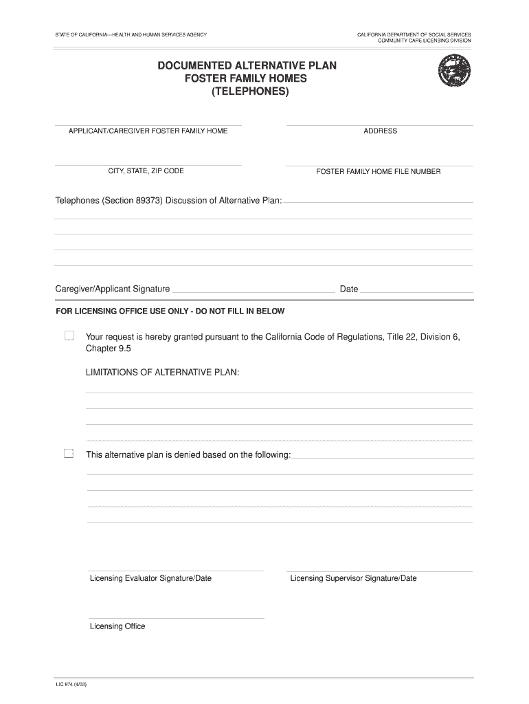 STATE OF CALIFORNIAHEALTH AND HUMAN SERVICES AGENCYCALIFORNIA DEPARTMENT OF SOCIAL SERVICES COMMUNITY CARE LICENSING DIVISIONDOCUMENTED ALTERNATIVE PLAN FOSTER FAMILY HOMES (TELEPHONES)APPLICANT/CAREGIVER