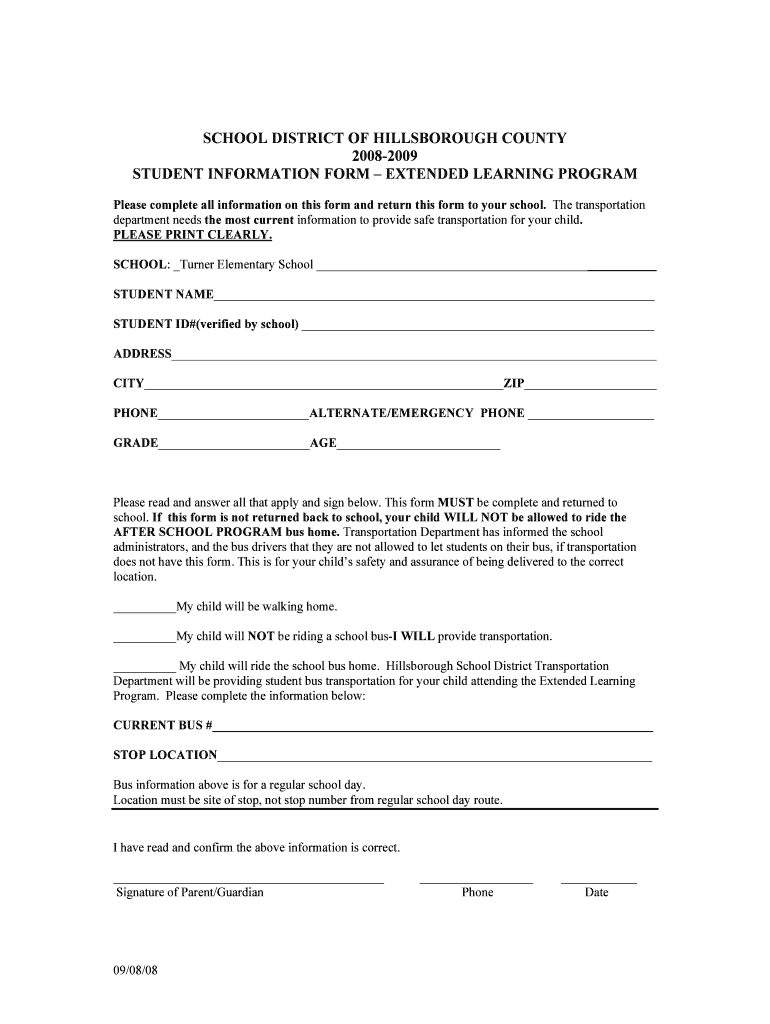 The Student Information Form can be completed by parents or guardians of students enrolled in the Extended Learning Program within the Hillsborough County School District.