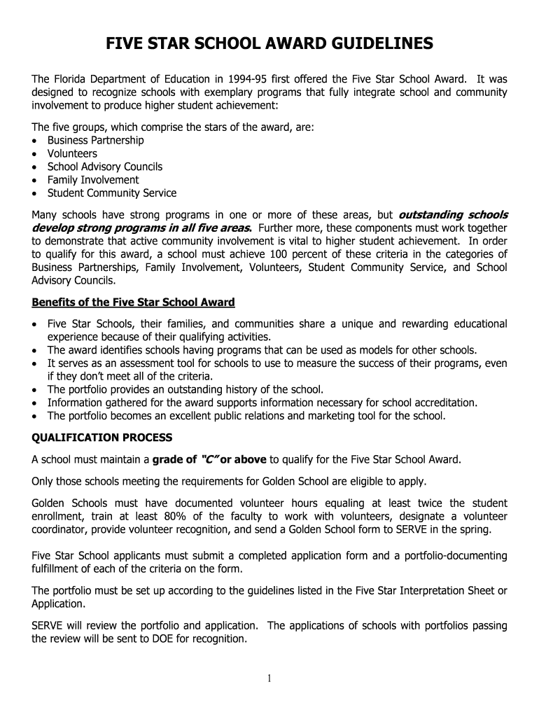 FIVE-STAR SCHOOL AWARD GUIDELINES The Florida Department of Education in 199495 first offered the Five-Star School Award. It was designed to recognize schools with exemplary programs that fully integrate