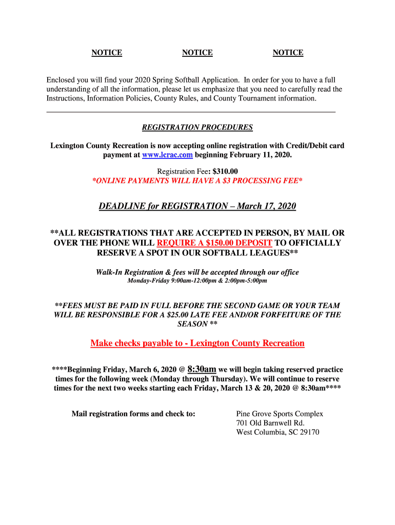 NOTICENOTICENOTICEEnclosed you will find your 2020 Spring Softball Application. In order for you to have a full understanding of all the information, please let us emphasize that you need to carefully