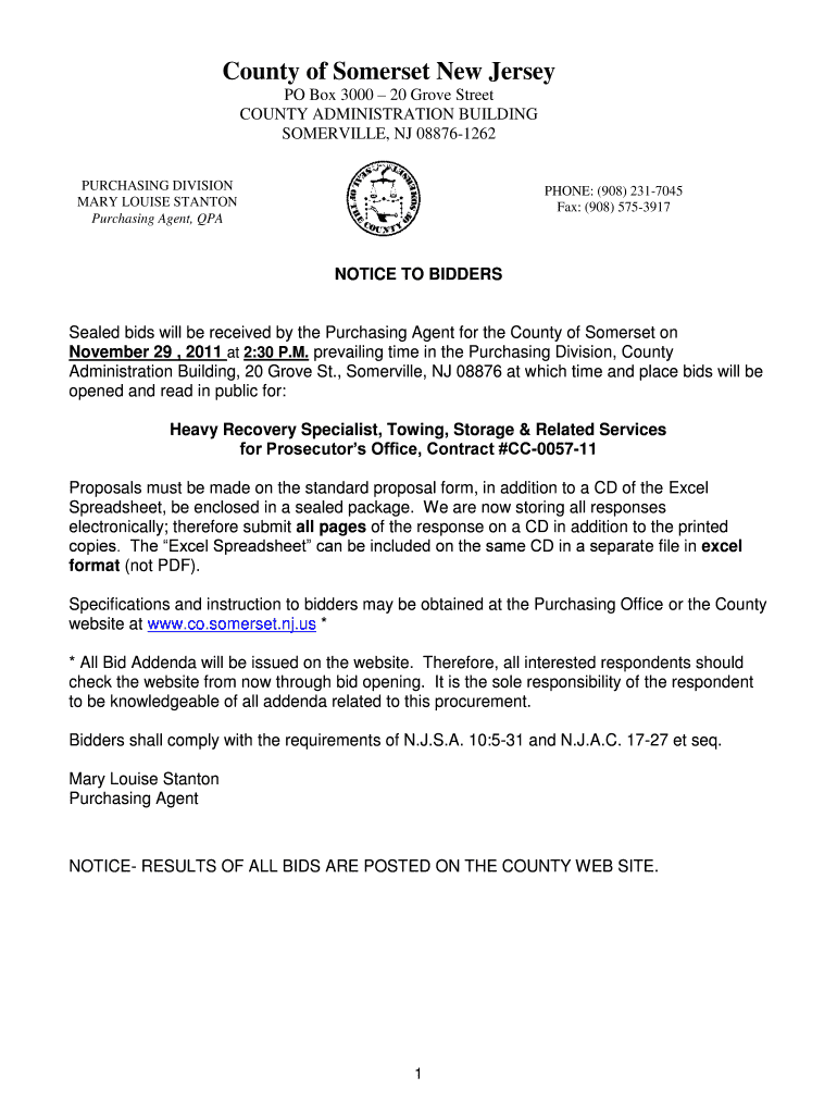 County of Somerset New Jersey PO Box 3000 20 Grove Street COUNTY ADMINISTRATION BUILDING SOMERVILLE, NJ 088761262 PURCHASING DIVISION MARY LOUISE STANTON Purchasing Agent, PAYPHONE: (908) 2317045