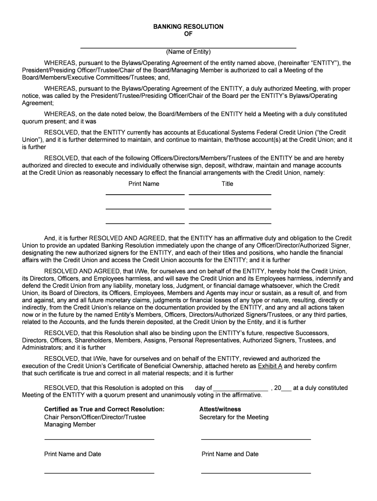Typically, business account banking resolutions must be filed by the business entity, including corporations, partnerships, and limited liability companies (LLCs) that intend to open or maintain a bank account.