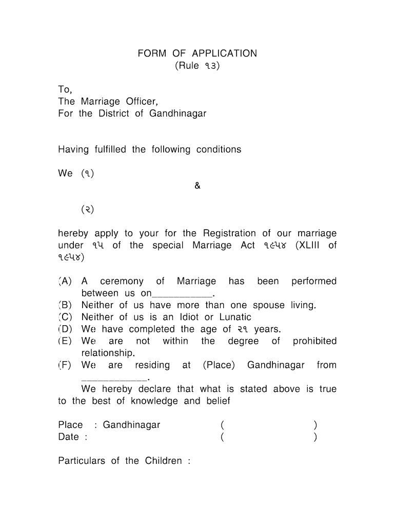 FORM OF APPLICATION (Rule 13) To, The Marriage Officer, For the District of Gandhinagar Having fulfilled the following conditions We (1) & (2) hereby apply to your for the Registration of our marriage