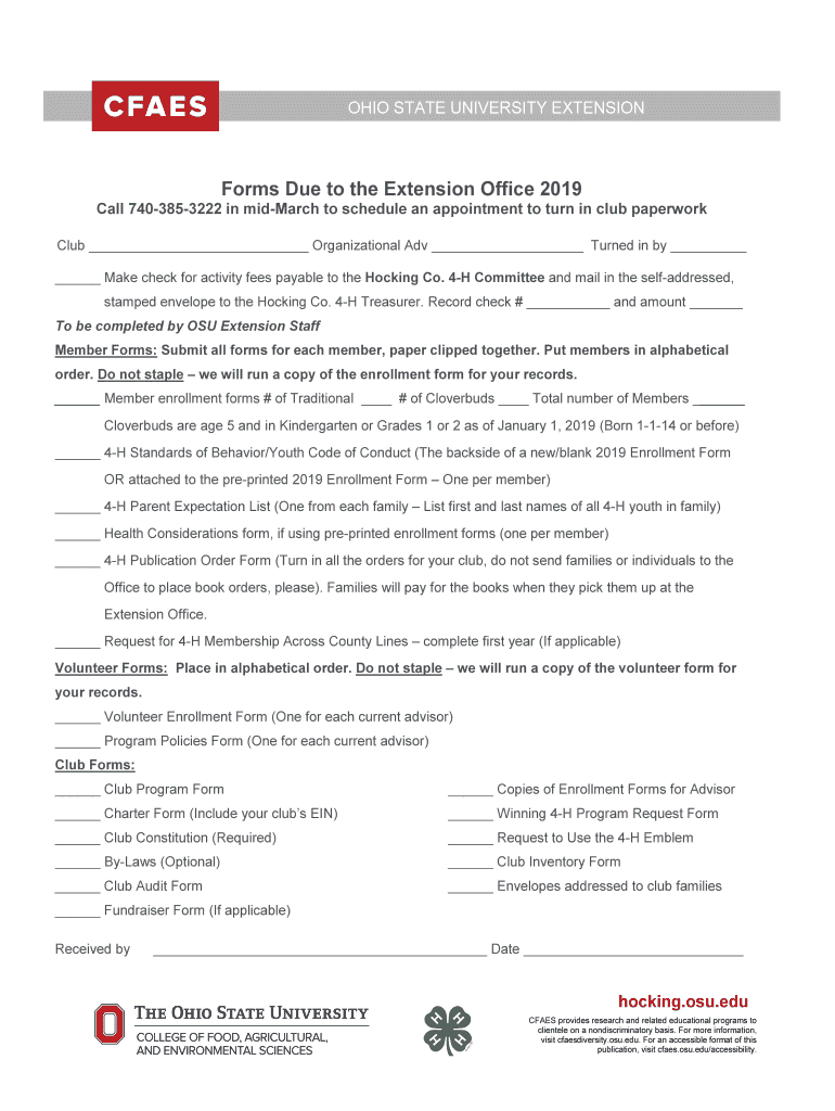 OHIO STATE UNIVERSITY EXTENSIONForms Due to the Extension Office 2019Call 7403853222 in mid-March to schedule an appointment to turn in club paperwork Club Organizational Adv Turned in by Make check