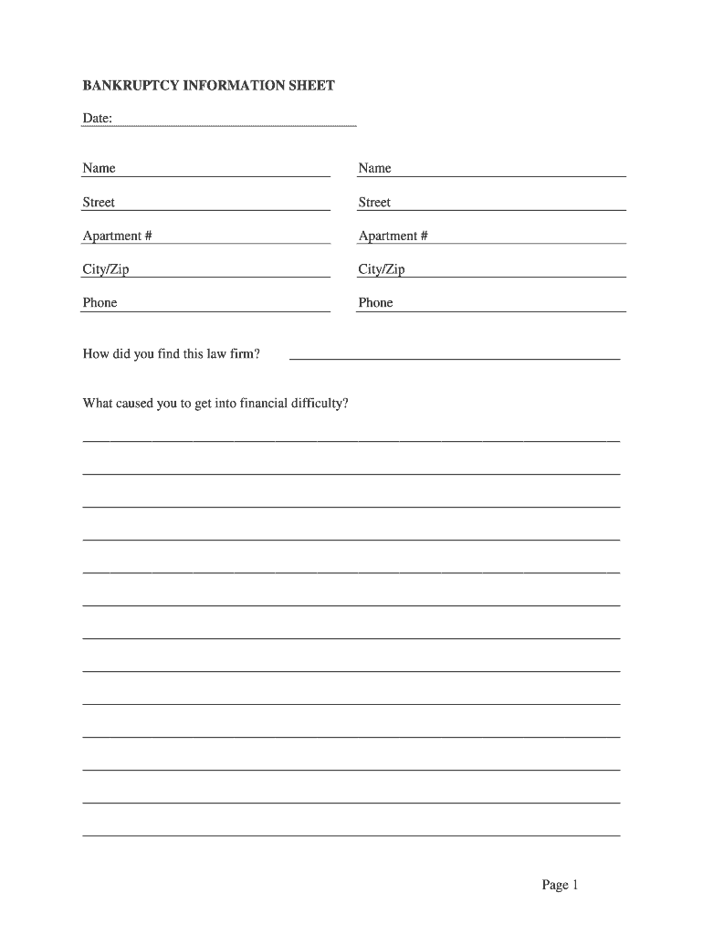 BANKRUPTCY INFORMATION SHEET Date:NameNameStreetStreetApartment #Apartment #City/SimCity/ZipPhonePhoneHow did you find this law firm? What caused you to get into financial difficulty? Page 1I use