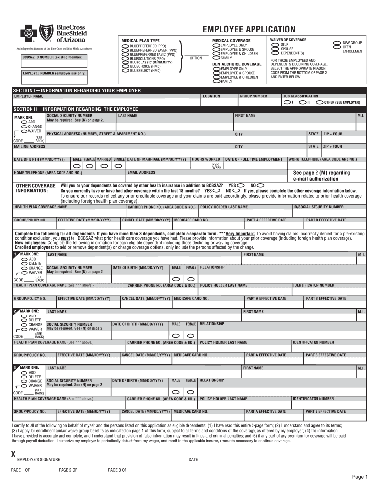 The form is designed for all employees of organizations that offer health insurance coverage through Blue Cross Blue Shield of Arizona. Eligibility includes new hires and current employees wishing to enroll or waive insurance.