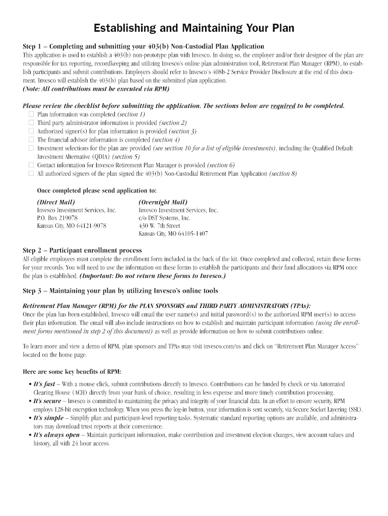 Employers pursuing a 403(b) Non-Custodial Retirement Plan Application can enjoy several advantages, primarily in the areas of tax reporting and recordkeeping. The application simplifies the management of participant contributions through the Retirement Plan Manager (RPM), a tool developed by Invesco. By utilizing this application, employers can more effectively track contributions, manage participant information, and increase operational efficiency.