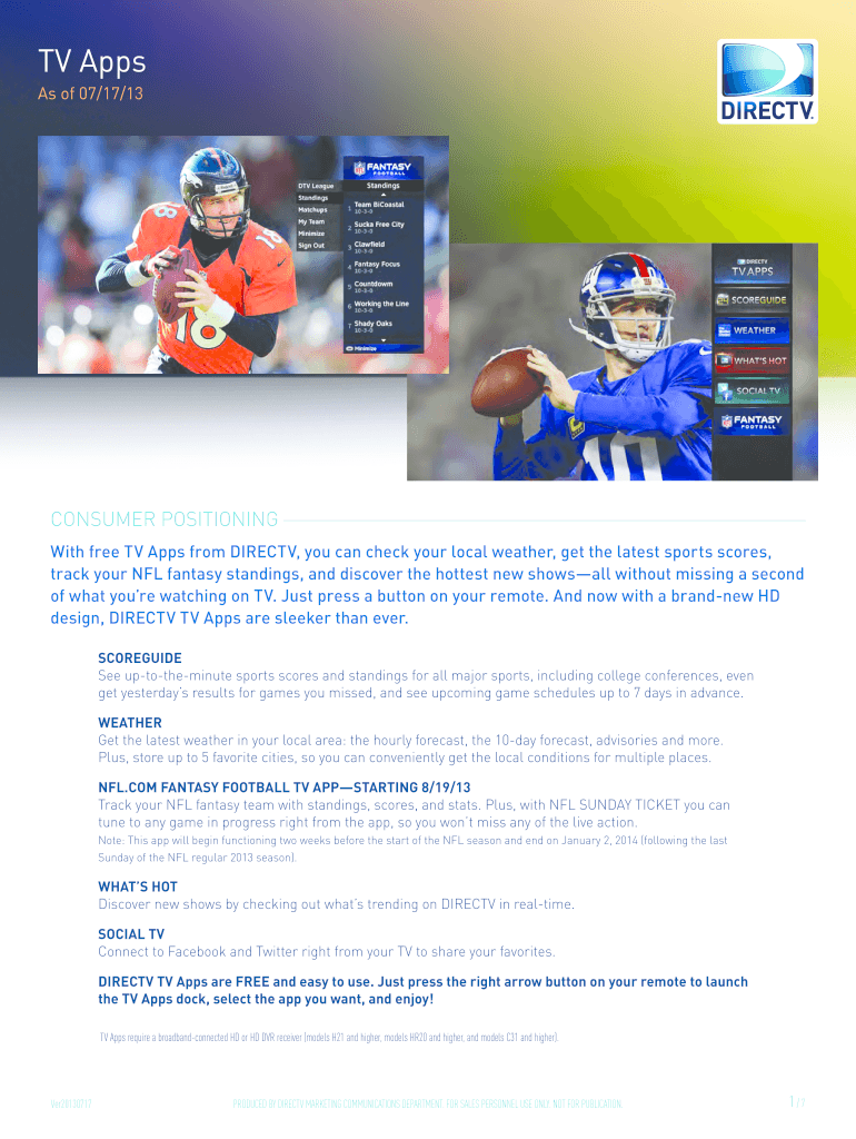 TV Apps As of 07/17/13 CONSUMER POSITIONING With free TV Apps from DirecTV, you can check your local weather, get the latest sports scores, track your NFL fantasy standings, and discover the hottest