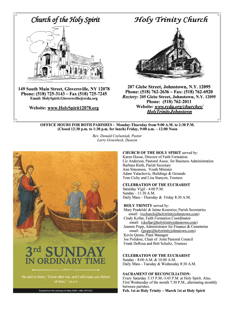 Church of the Holy Spirit149 South Main Street, Gloversville, NY 12078 Phone: (518) 7253143 Fax (518) 7257245 Email: HolySpirit. Gloversville CDA.website: www.HolySpirit12078.org207 Globe N.Y. Phone: