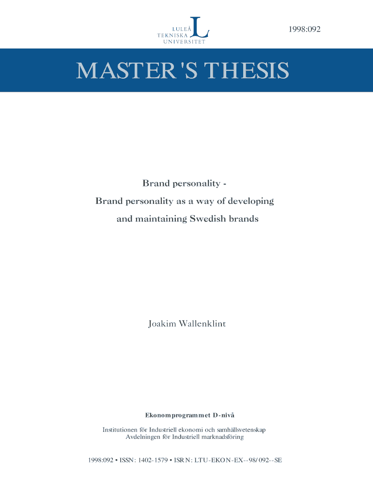1998:092 MASTER IS THESIS Brand personality as a way of developing and maintaining Swedish brands Oakum Wallenklint Ekonomprogrammet DIV Institutionen for Industrial economic och samhllsvetenskap