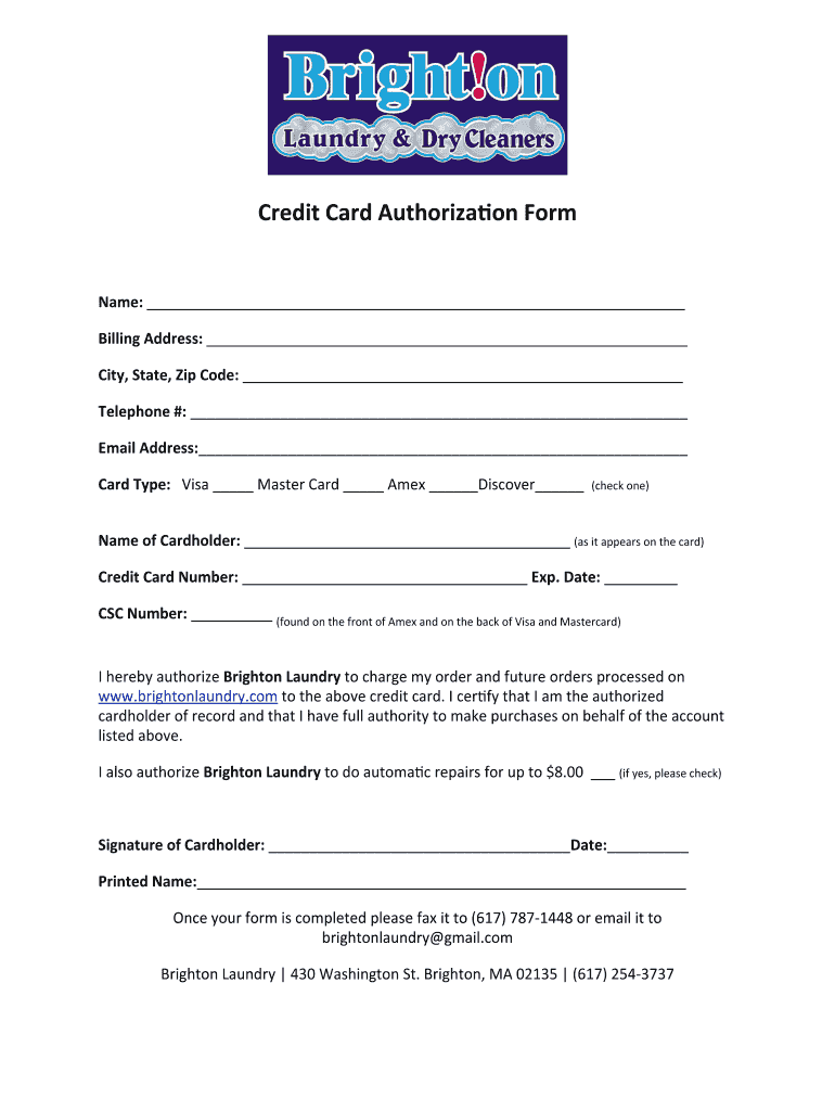 Email, fax, or share your brighton laundry - cc form via URL. You can also download, print, or export forms to your preferred cloud storage service.