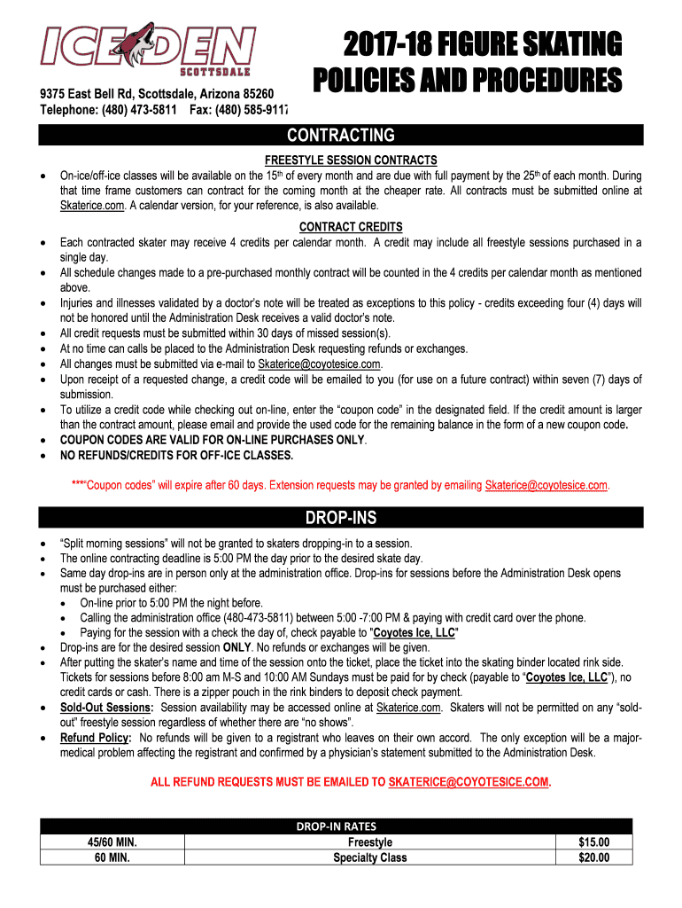 9375 East Bell Rd, Scottsdale, Arizona 85260 Telephone: (480) 4735811 Fax: (480) 5859117201718 FIGURE SKATING POLICIES AND PROCEDURESCONTRACTING FREESTYLE SESSION CONTRACTS Nice/office classes will