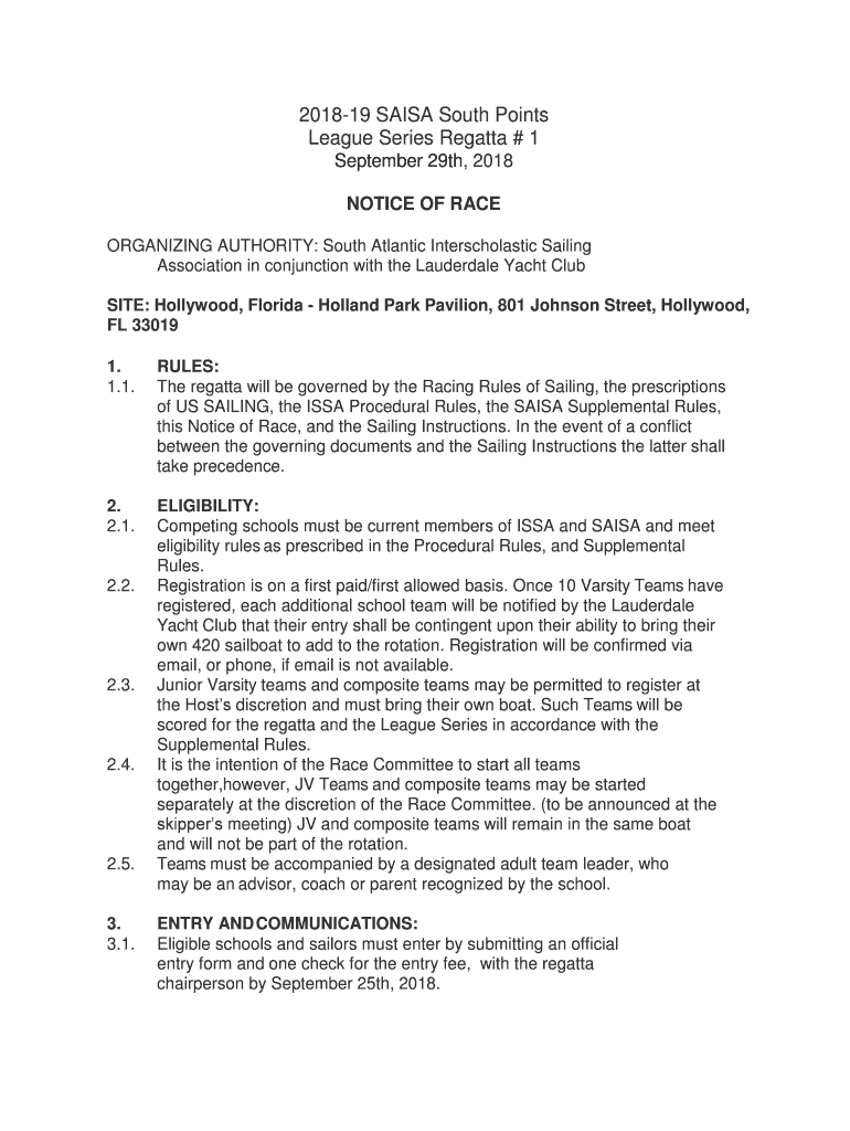 201819 SALSA South Points League Series Regatta # 1 September 29th, 2018 NOTICE OF RACE ORGANIZING AUTHORITY: South Atlantic Interscholastic Sailing Association in conjunction with the Lauderdale
