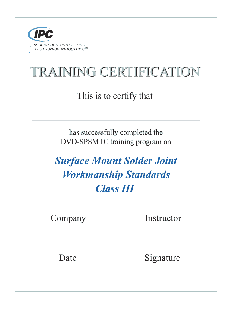 Anyone who has successfully completed the DVD-SPSMTC training program on Surface Mount Solder Joint Workmanship Standards Class III is eligible for this certification.