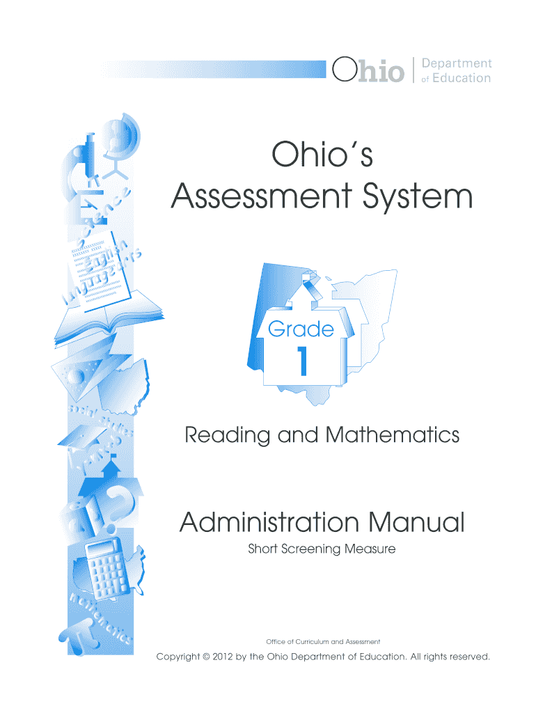 Department of EducationOhios Assessment SystemGrade1 Reading and MathematicsAdministration Manual Short Screening MeasureOffice of Curriculum and AssessmentCopyright 2012 by the Ohio Department of