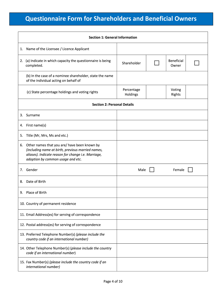 QuestionnaireForm for ShareholdersandBeneficialOwnersFINANCIALSERVICESAUTHORITYBoisDeRoseAvenue P.O. Box991 Victoria MAH Seychelles:+2484380800 Fax:+2484380888 Website:www.fsaseychelles.sc Email:inquiries