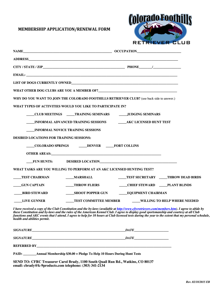 MEMBERSHIP APPLICATION/RENEWAL FORENAME OCCUPATION ADDRESS CITY / STATE / ZIP PHONE / EMAIL: LIST OF DOGS CURRENTLY OWNED WHAT OTHER DOG CLUBS ARE YOU A MEMBER OF? WHY DO YOU WANT TO JOIN THE COLORADO