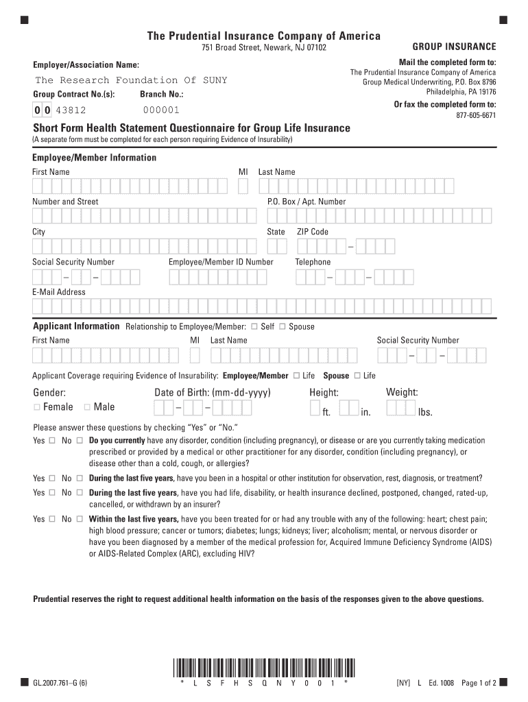 The Short Form Health Statement Questionnaire for Group Life Insurance is a critical document used by The Prudential Insurance Company to evaluate the insurability of applicants. This form is pivotal in the underwriting process, helping insurers assess the risk associated with providing group life insurance to individuals. By completing this questionnaire, applicants provide essential health information that is necessary for evaluating their eligibility. Both applicants and insurers benefit significantly from this streamlined assessment tool, ensuring that the underwriting process is efficient and informative.