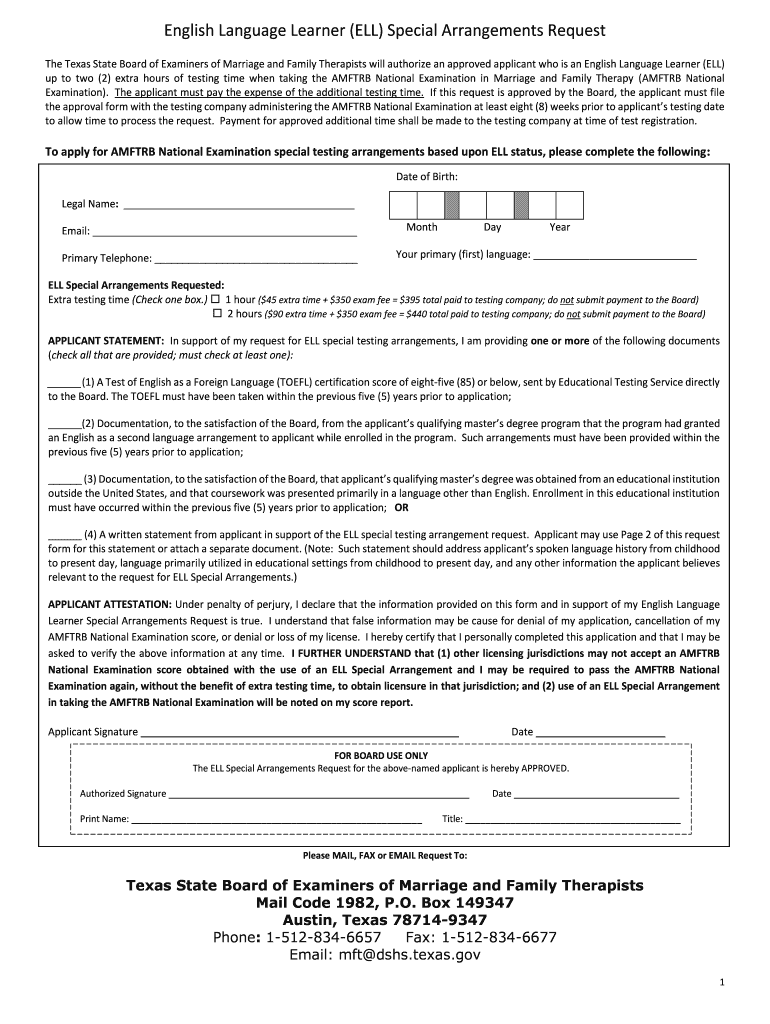 The Texas State Board of Examiners of Marriage and Family Therapists will authorize an approved applicant who is an English Language Learner