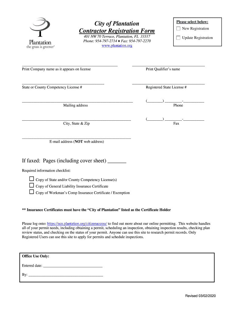 Get the free ALL CONTRACTORS MUST BE REGISTERED WITH THE CITY OF PLANTATION