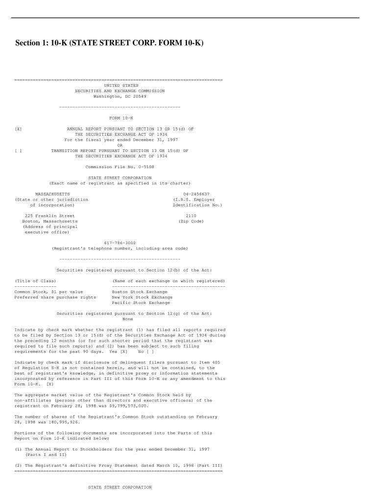 Section 1: 10K (STATE STREET CORP. FORM 10K) UNITED STATES SECURITIES AND EXCHANGE COMMISSION Washington, DC 20549 FORM 10K X ANNUAL REPORT PURSUANT TO SECTION 13 OR 15(d) OF THE SECURITIES EXCHANGE