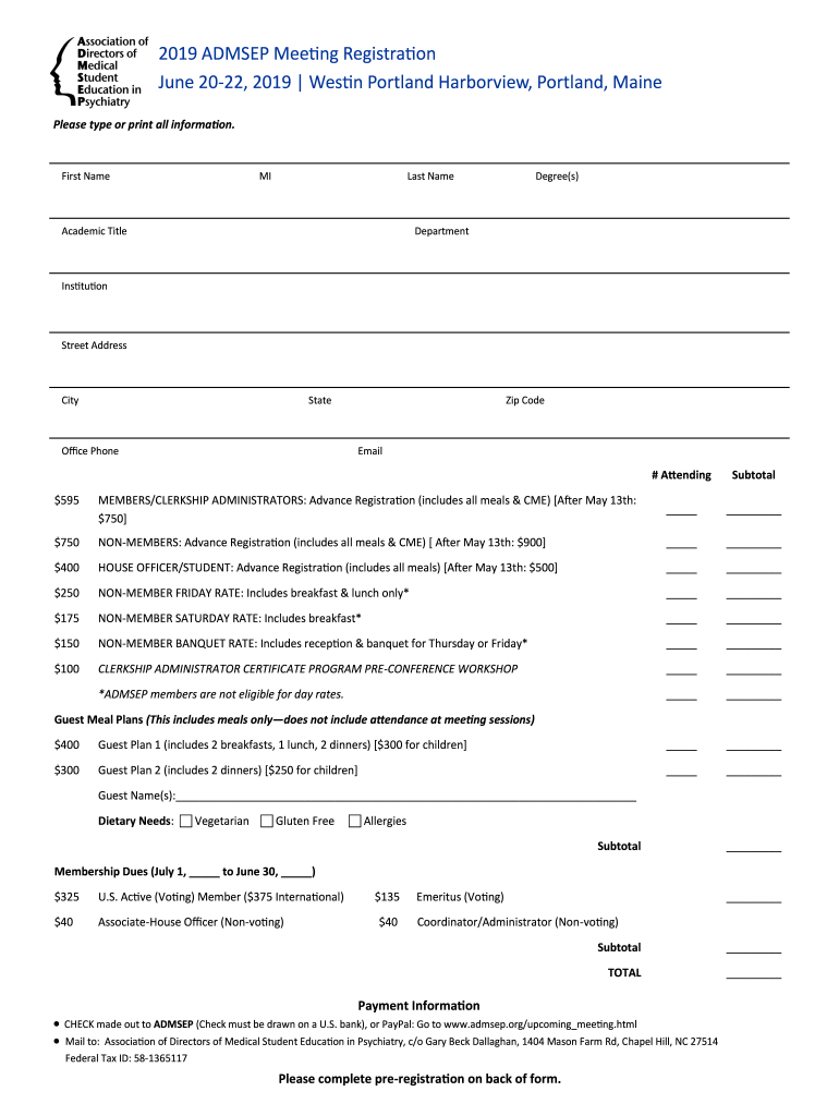 2019 ADM SEP Meeting Registration June 2022, 2019 Weston Portland Harbor view, Portland, Maine Please type or print all information. First NameMILast Nonacademic TitleDegree(s)DepartmentInstitutionStreet