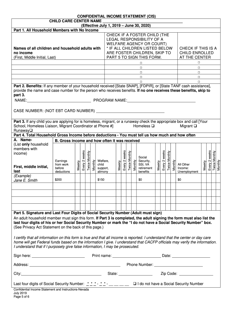 CONFIDENTIAL INCOME STATEMENT (CIS) CHILD CARE CENTER NAME (Effective July 1, 2019, June 30, 2020) Part 1. All Household Members with No Income CHECK IF A FOSTER CHILD (THE LEGAL RESPONSIBILITY OF